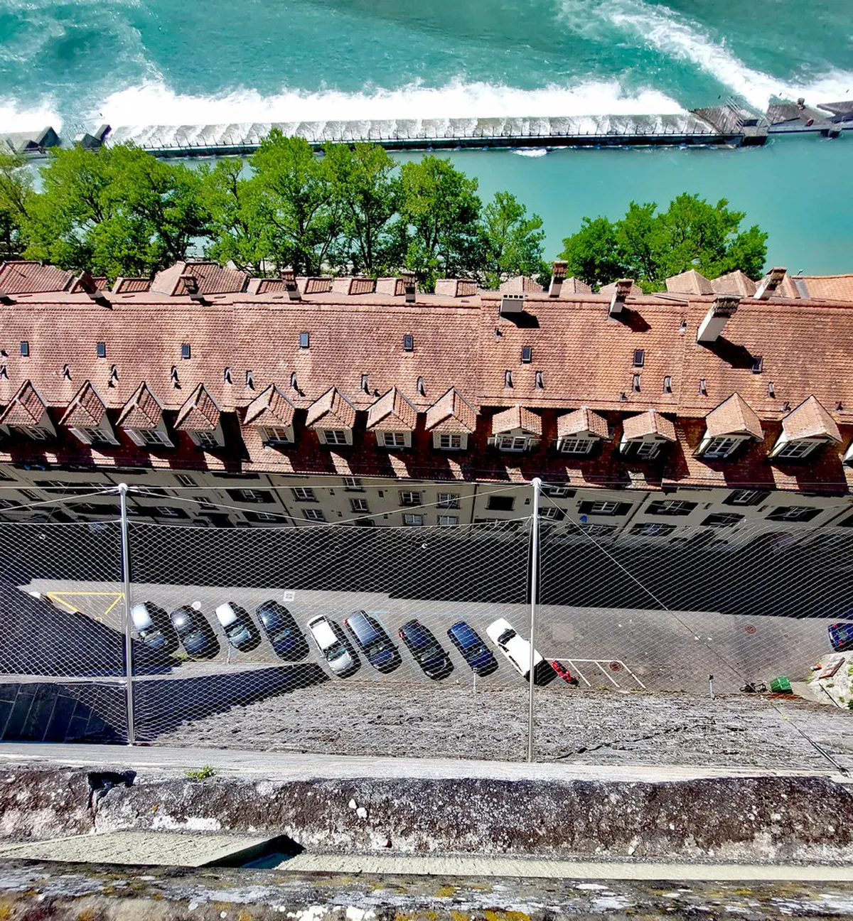 If you miss the Marzili exit, stay calm and swim toward the bank. Look for the next available safety ramp or ladder immediately. Do not try to swim against the current to go back. There are dangerous weirs further downstream that you must avoid at all costs.